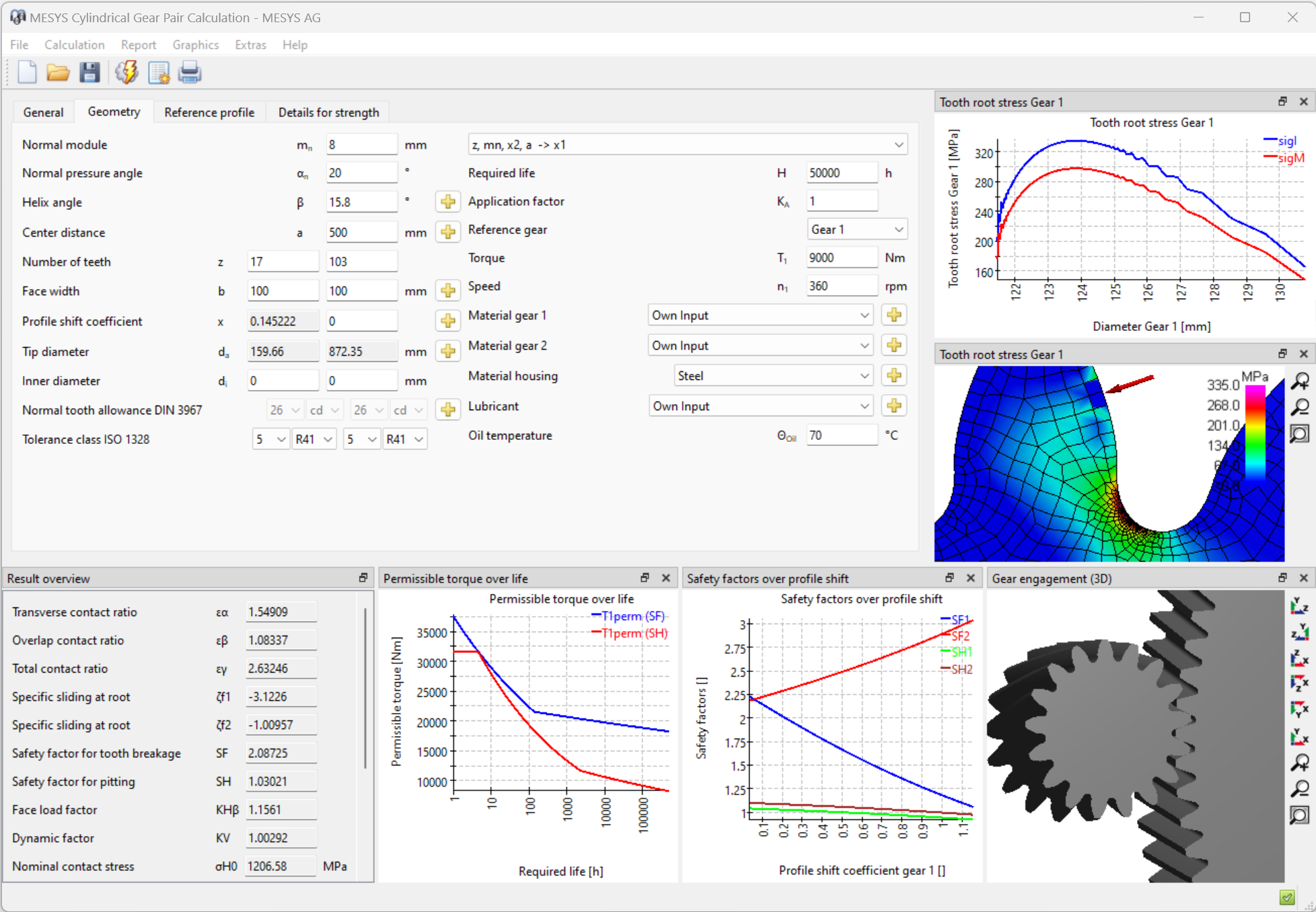 - Festigkeitsberechnung nach ISO 6336 Teile 1, 2, 3, 5, 6. Verschiedene Optionen für die Zahndicke und die Überdeckung können gewählt werden.
